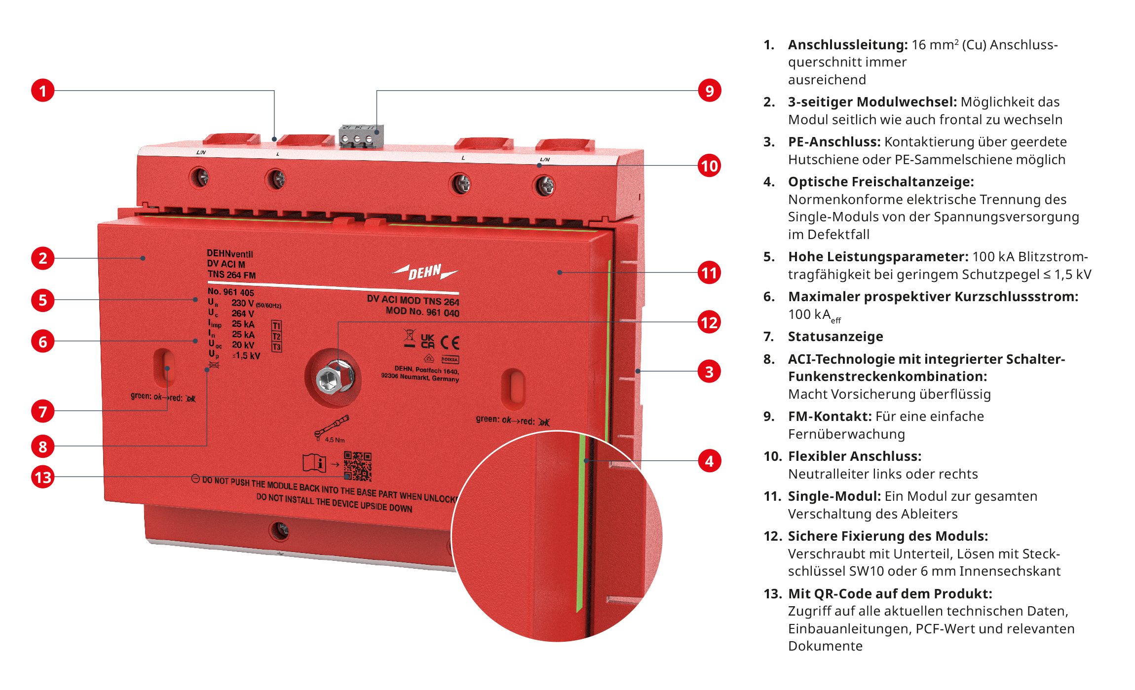 Genau an diesem Punkt setzt das Sicherheitskonzept des DEHNventil ACI an. Die integrierte ACI-Technologie sorgt dafür, dass sich das Schutzmodul im Defekt- oder am Lebensdauerende selbstständig, sicher und normenkonform elektrisch vom Netz trennt. Dadurch wird das Modul spannungsfrei, ohne dass für den Tausch des Überspannungsableiters die gesamte Anlage abgeschaltet werden muss. Ein Modultausch ist somit auch unter Spannung möglich, selbstverständlich unter Beachtung der gesetzlichen Vorgaben zum Arbeitsschutz und durch entsprechend qualifiziertes Fachpersonal, das zum Arbeiten an solchen Anlagen qualifiziert ist.